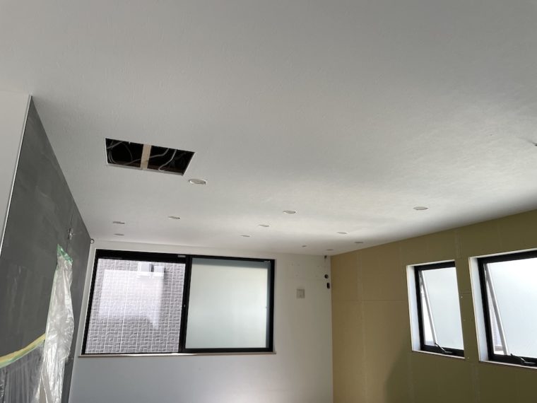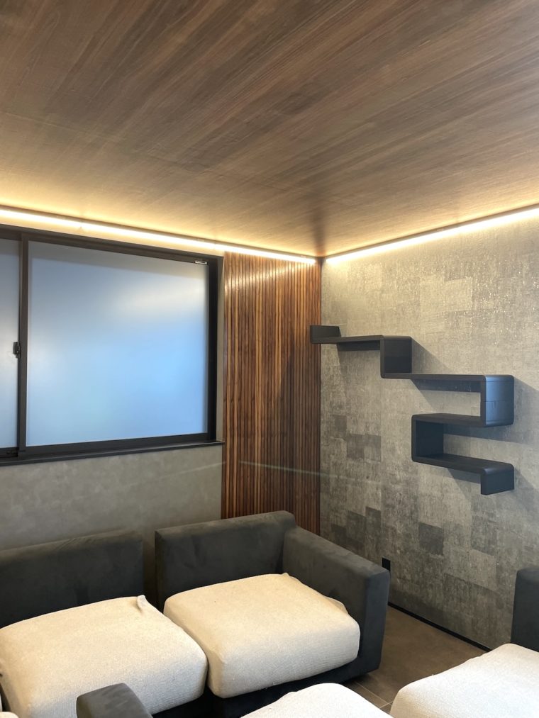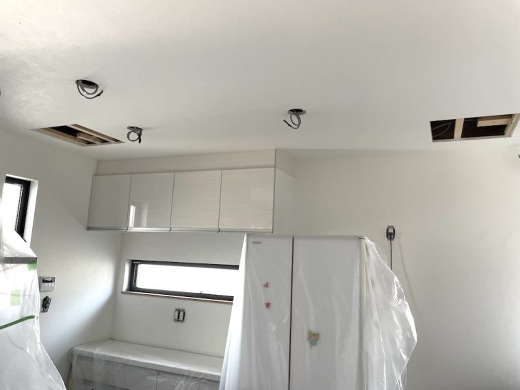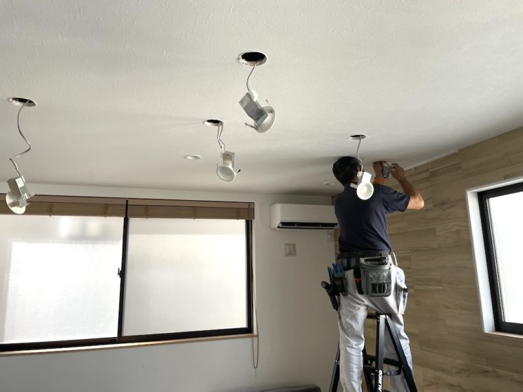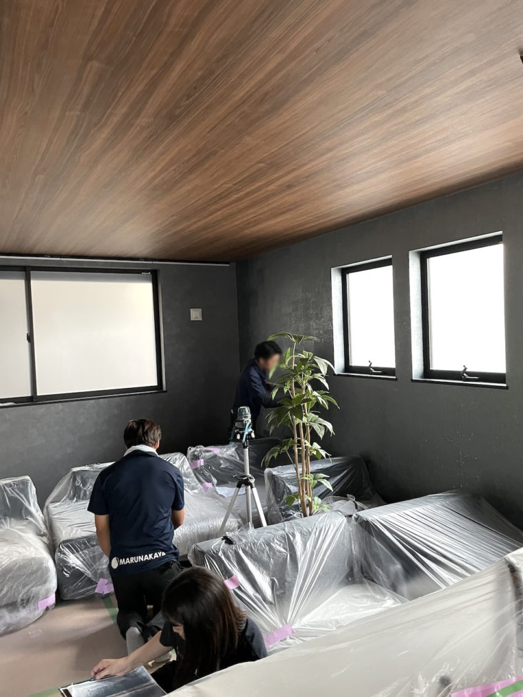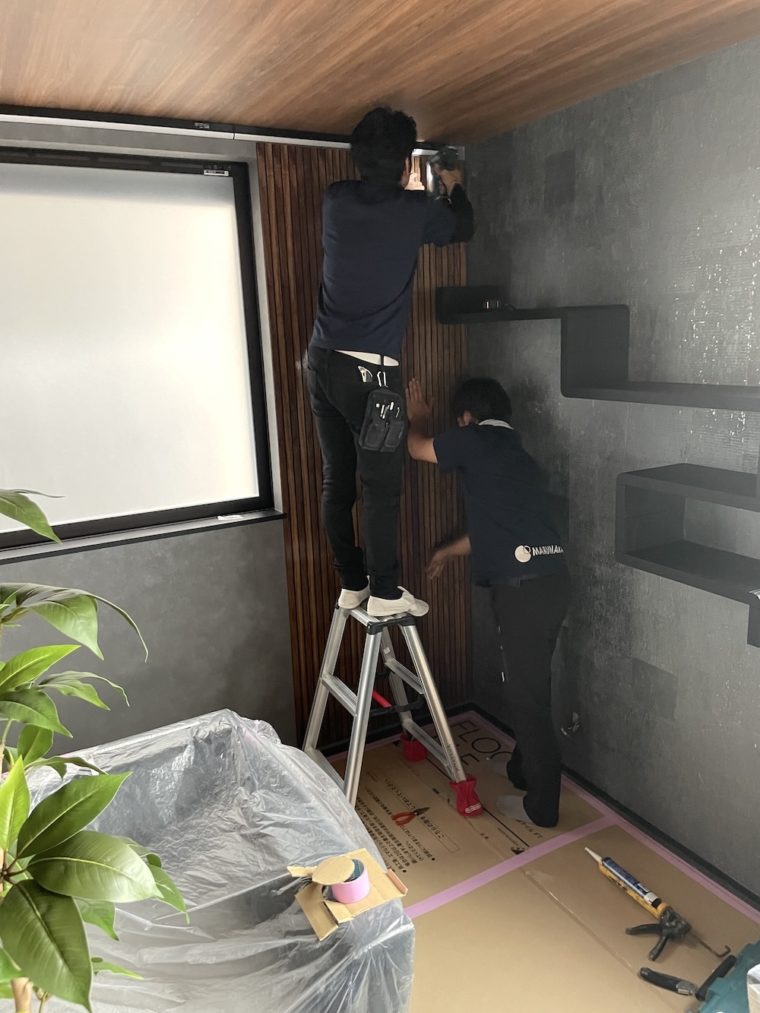 ただ天井にはあまり貼らない薄い素材だから、ダウンライトの跡がうっすら見えることがあるんだけど、その件もオーナー様に確認した上での施工でした。