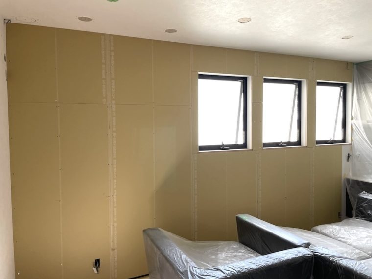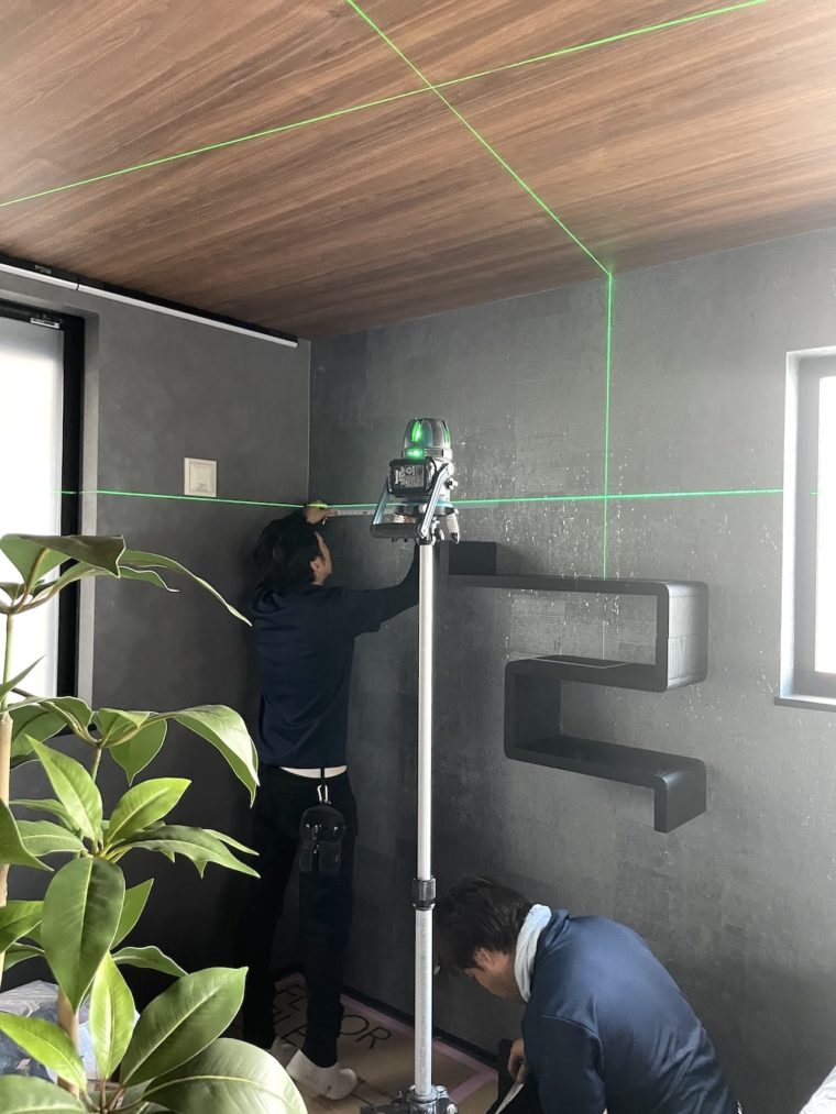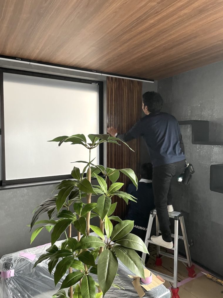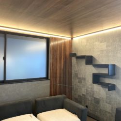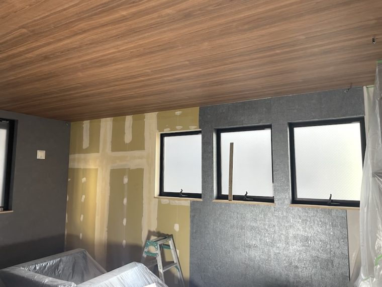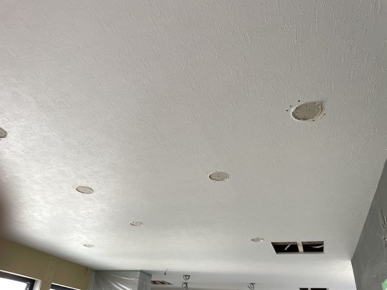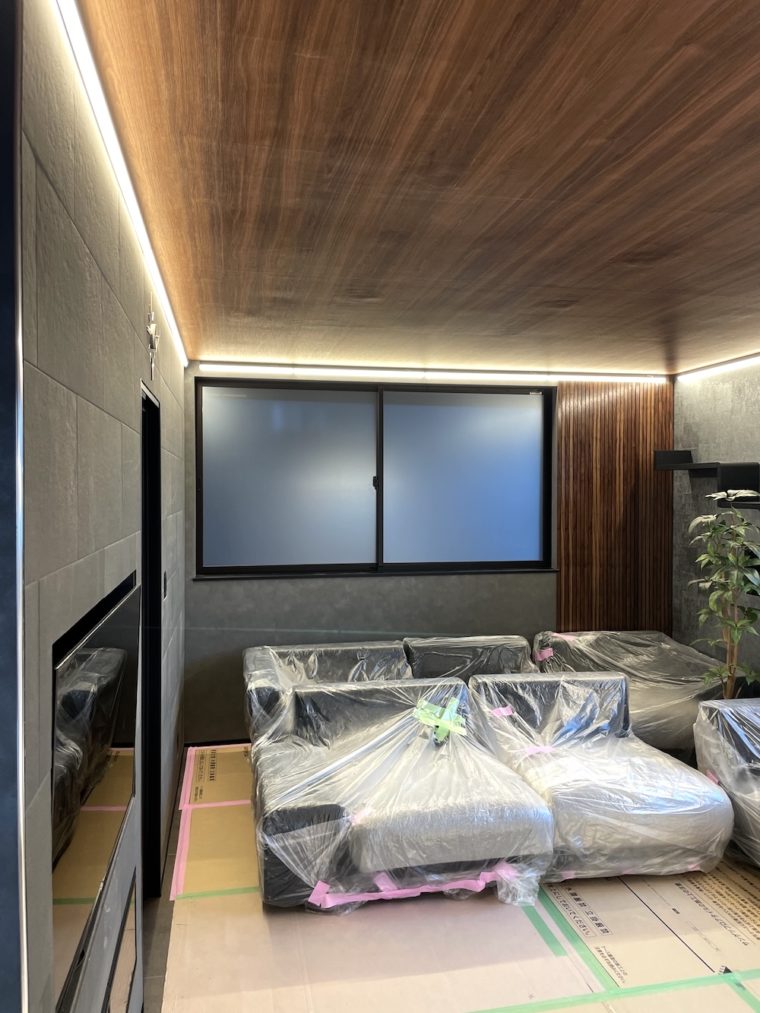 ただ天井にはあまり貼らない薄い素材だから、ダウンライトの跡がうっすら見えることがあるんだけど、その件もオーナー様に確認した上での施工でした。