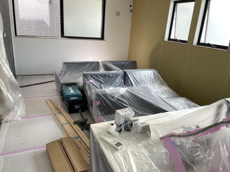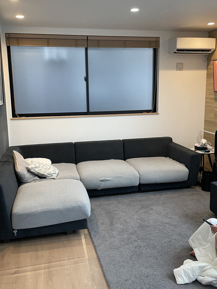 あいにくソファが室内から出せないこともあって、貼り付けてはどかしての作業で見た目以上に手間がかかっています。